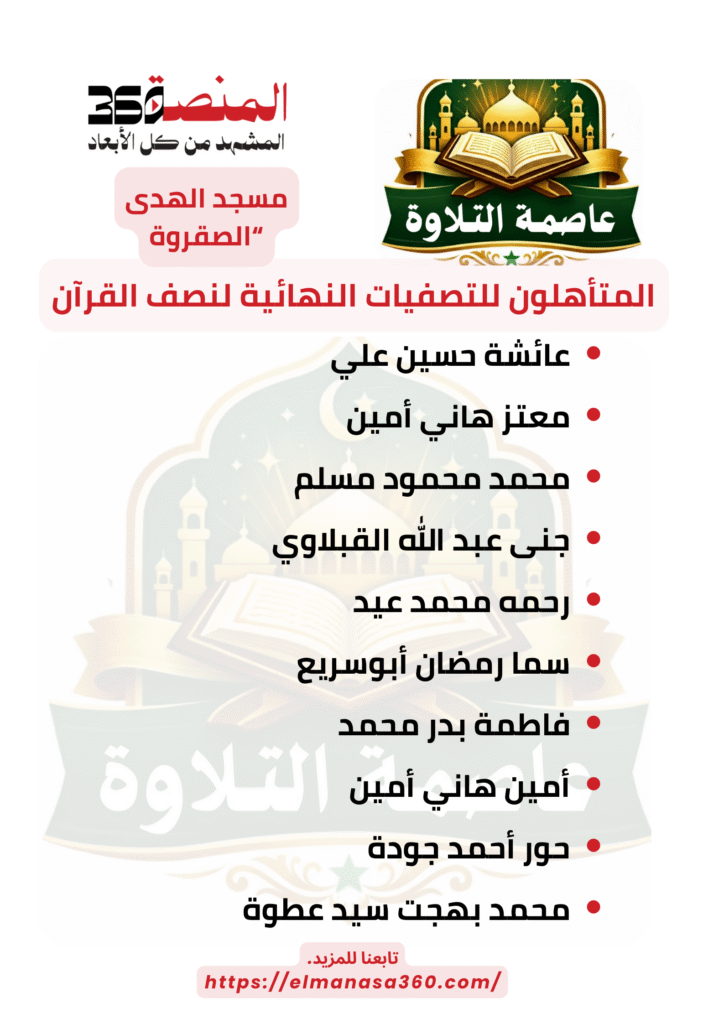 وتتقدم اللجنة المنظمة بخالص التهنئة للمتأهلين، متمنين لهم دوام التوفيق والسداد، وأن تظل قرية ميت حلفا منارة للقرآن الكريم، وراية مرفوعة في خدمة كتاب الله، لتستحق دائمًا لقب عاصمة التلاوة.