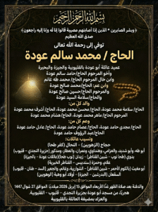 وتتقدم إدارة التحرير بخالص التعازي والمواساة إلى أسرة الفقيد، داعين الله عز وجل أن يتغمده بواسع رحمته، وأن يُلهم أهله وذويه الصبر والسلوان.