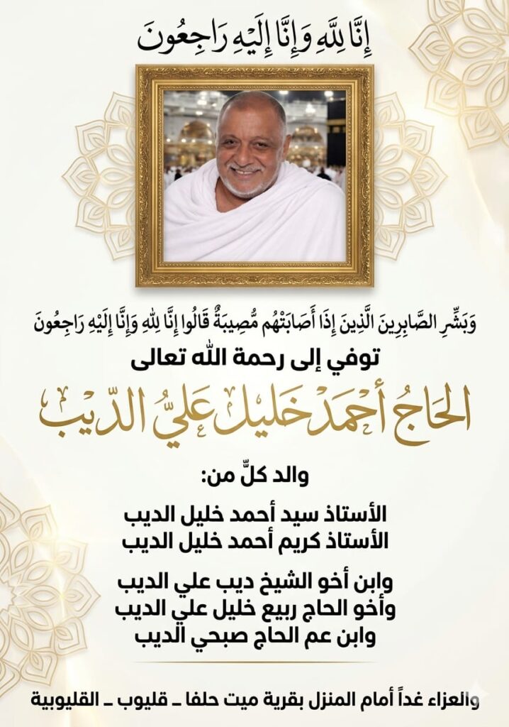 بقرية ميت حلفا – قليوب – القليوبية، حيث يتوافد الأهل والأصدقاء لتقديم واجب العزاء والدعاء للفقيد بالرحمة والمغفرة.