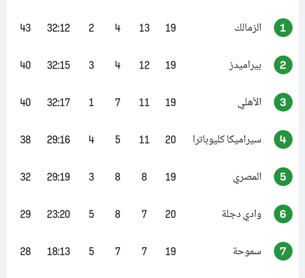 بهذا الانتصار، رفع الزمالك رصيده من النقاط ليقفز إلى المركز الأول في جدول ترتيب الدوري المصري، متفوقًا على منافسيه المباشرين في صراع اللقب. ويأتي في مقدمة هؤلاء المنافسين كل من الأهلي و**بيراميدز**، اللذين يواصلان مطاردة الصدارة في موسم يعد من أكثر المواسم إثارة في السنوات الأخيرة.
