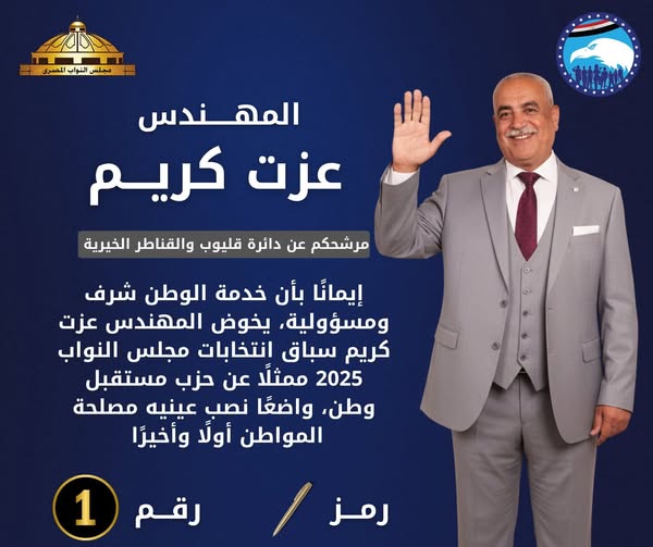 تقدّم في المشهد الانتخابي حتى الآن عزّت عبد العزيز (عزّت كريم)، مرشح حزب مستقبل وطن ويحمل رمز القلم، حيث يتمتع بدعم حزبي واسع ونشاط ميداني ملحوظ في أرجاء الدائرة، ما يمنحه نقطة انطلاق متقدمة، خصوصًا في ظل تزايد عدد المرشحين المستقلين.