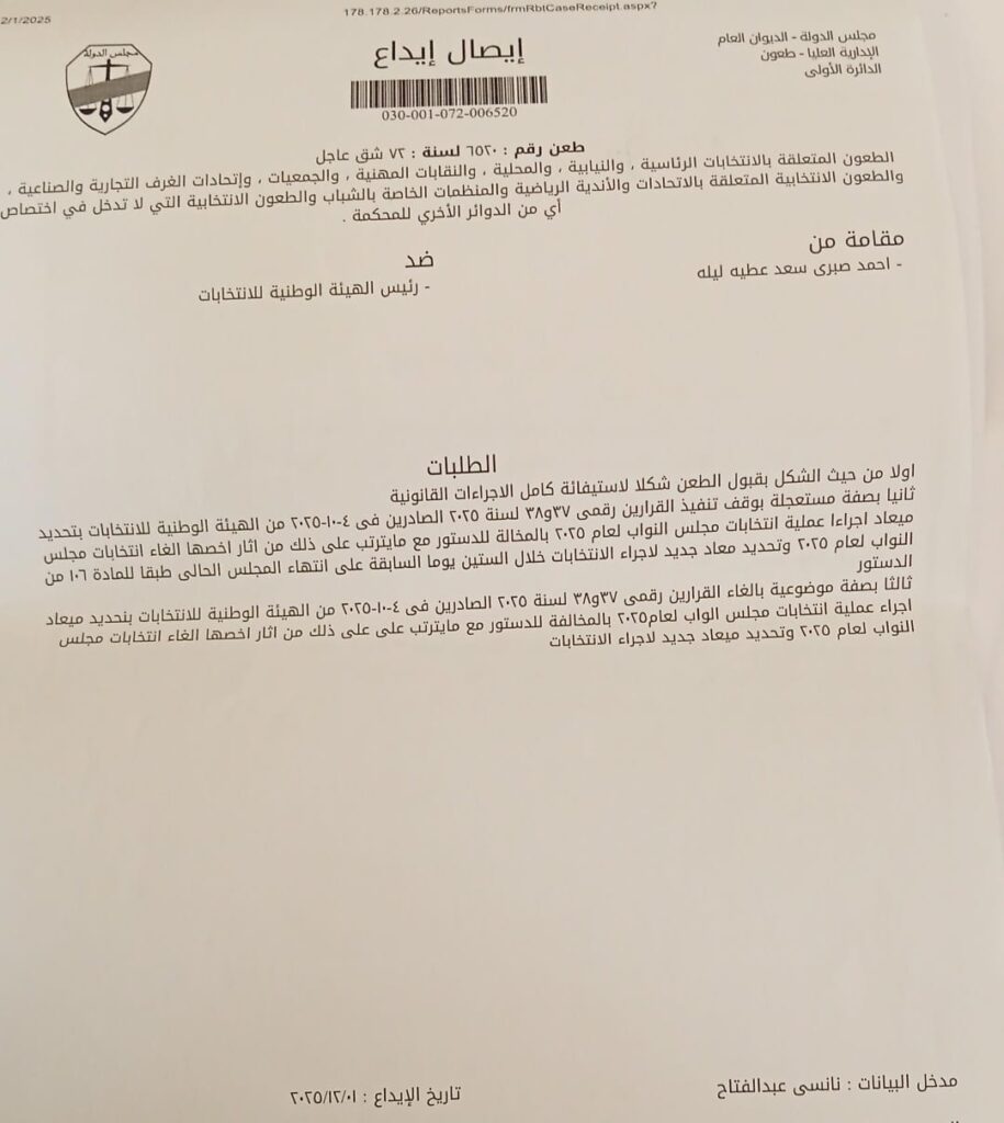 تقدم أحمد صبري سعد عطيه ليله المحامي بالنقض والإدارية العليا بميت غمر بطعن أمام المحكمة الإدارية العليا قيد برقم 6520 لسنة 72 ق يطالب بإلغاء إنتخابات مجلس النواب لعام 2025 لوجود مخالفة دستورية في تحديد ميعاد الإنتخابات بالمخالفة لنص م 106 من الدستور .