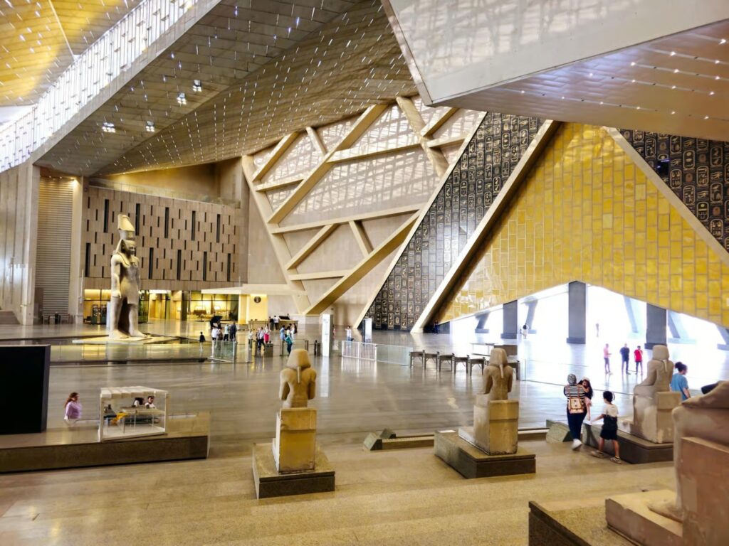 بُني المتحف المصري الكبير حول درج ضخم مُزيَّن بتماثيل ومقابر ضخمة، يؤدي إلى واجهة بانورامية واسعة تُطل على الأهرامات.