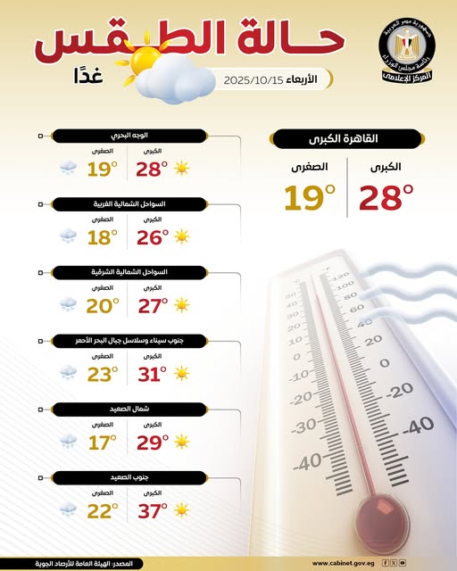وأوضحت الهيئة أن الطقس يسود بطابع خريفي، حيث يكون مائلًا للبرودة في الصباح الباكر، ومائلًا للحرارة نهارًا على أغلب الأنحاء، بينما يميل للحرارة على جنوب سيناء وجنوب الصعيد. ومع بداية الليل يكون الطقس معتدلًا، ليتحوّل إلى مائل للبرودة في آخره.