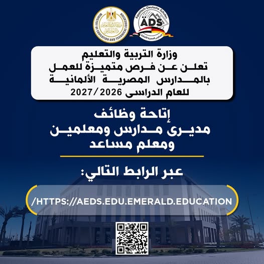 تعلن وزارة التربية والتعليم والتعليم الفنى فتح باب التقديم لوظائف (مديري مدارس – معلمين رياض أطفال – معلم مساعد رياض أطفال) بالمدارس المصرية الألمانية للعام الدراسى 2026 / 2027.