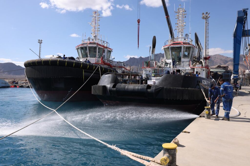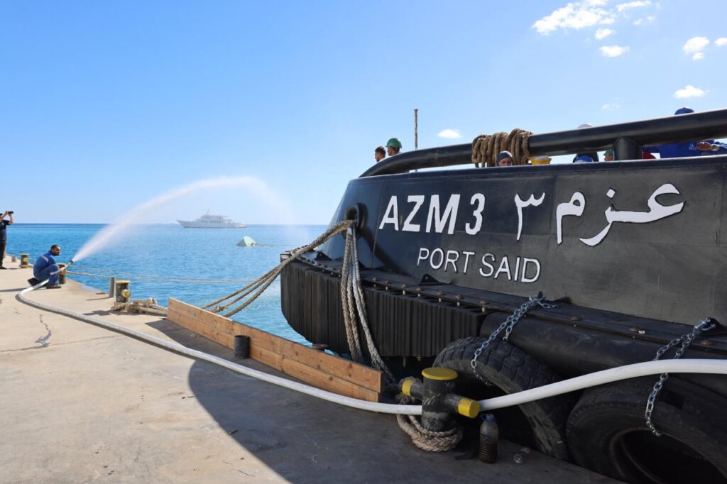 بدأت الجولة بتفقد أعمال بناء القاطرات البحرية من طراز” عزم” بساحة الترسانة، حيث يجري العمل حالياً لاستكمال أعمال بناء 8 قاطرات يتم بناؤهم على التوازي وذلك بعد تسليم القاطرتين “عزم 1″ و”عزم 2” .