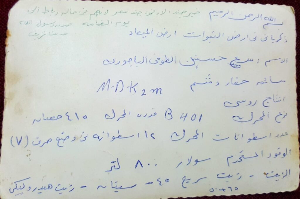 ثم شرح وافٍ لمواصفات حفاره الذي كان يقوده في حرب أكتوبر 1973.