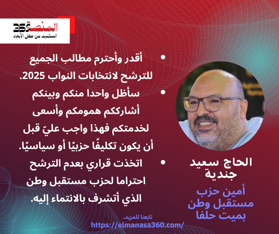 وقال جندية لـ”المنصة 360″ إنه لن يترشح لانتخابات مجلس النواب القادمة لعد أسباب أهمها الالتزام الحزبي واحترام مستقبل وطن ودعمه الكمل للحزب، كذلك ايمانه بأن خدمة الناس بخلاف كونها التزام حزبي إلا أنها واجب لا ينتهي أبدا.